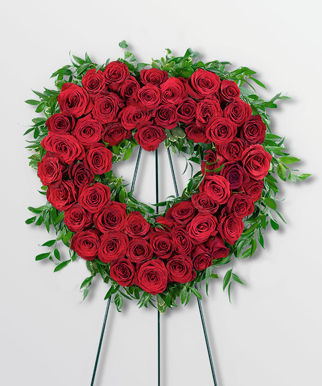 Our Abiding Love Heart is a classic and beautiful choice for funeral flowers or a celebration of life ceremony. This standing spray features beautiful red roses and a variety of premium foliage, artfully designed to be displayed on a heart shaped easel. Red roses symbolize respect, love, and courage in a sympathy design. Funeral flowers are a meaningful way to celebrate the life of the deceased, while providing comfort to the friends and family left behind.