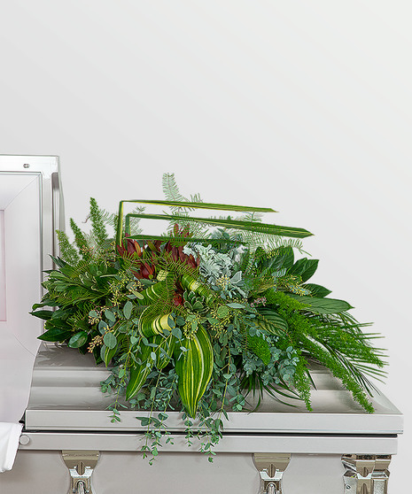 Surround your loved one in nature with Our Beloved Botanics Casket Spray featuring Foxtail Fern, Calathea, Aralia Fatsia Variegated Aspidistra, Emerald, Flax, and other premium foliage. The Beloved Botanics Casket Spray is stunning, with its natural, organic color and design. The casket flowers are typically provided by the family of the deceased as a heartfelt memorial from the family and are designed to sit on the lid of the casket for a funeral service or memorial.