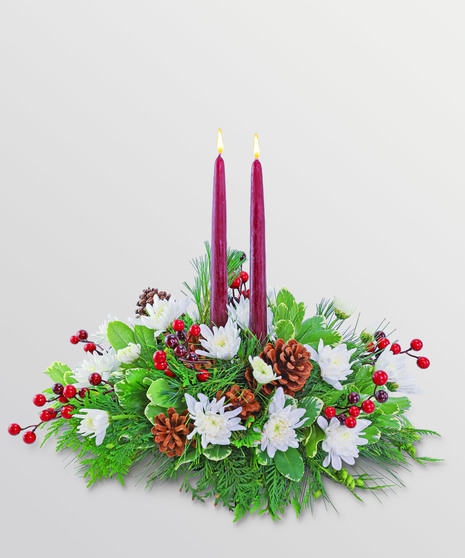 The Christmas Carol Centerpiece features Mums, berries, pinecones, candles, assorted Evergreen, and other premium foliage. A bundle of complementary holiday colors and textures, it's decked out with festive trimmings in beautiful reds, whites, and greens. This festive centerpiece is designed to set the tone for any holiday gathering.
