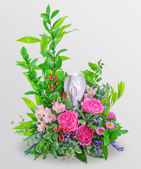 This peaceful porcelain angel sculpture, surrounded by radiant Roses, Alstroemeria, Asters, and premium foliage, is a touching tribute to a rich life. Our Guardian Angel Keepsake is a beautiful and meaningful keepsake mixed with fresh flowers to honor those who have passed away. This would be Ideal for religious services, funerals, memorials, or a celebration of life ceremony. Our Guardian Angel Keepsake is a stunning sympathy gift to commemorate the life of someone who has passed on. Memorial flowers bring healing to family and friends and are the perfect way to honor and celebrate a loved one's life.