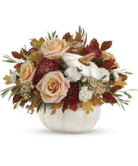 Elegant crème roses blend with the heartwarming hues of autumn in this charming bouquet, artfully arranged in a white lidded pumpkin bowl, a versatile fall decor favorite!