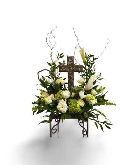 This beautifully crafted sympathy cross offers a heartfelt tribute to a loved one’s memory. Made from durable materials such as wood, resin, or metal, it features a timeless design symbolizing faith, hope, and eternal peace. The base or open framework of the cross allows for the addition of silk or fresh flowers, greenery, or seasonal accents, making it a meaningful and customizable piece for memorial services, gravesites, or home remembrance displays. Whether displayed alone or adorned with blooms, this cross stands as a lasting symbol of love and remembrance.