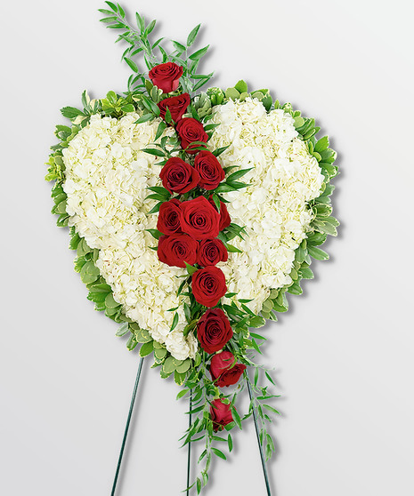 Our Lost Love Heart is a classic and beautiful choice for funeral flowers or a celebration of life ceremony. This standing spray features beautiful red roses, white hydrangea, and a variety of premium foliage, artfully designed to be displayed as a broken heart. Red roses symbolize respect, love, and courage in a sympathy design. Funeral flowers are a meaningful way to celebrate the life of the deceased, while providing comfort to the friends and family left behind.