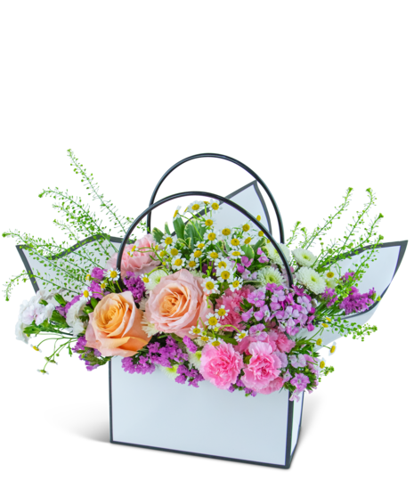 The Monet Garden Tote is a beautifully crafted flower arrangement, showcasing our finest seasonal blooms in a soft peach and blue color palette. While the actual assortment of flowers may differ from the picture, our commitment to providing exceptional quality and value remains unwavering. Presented in an exquisite Flower gift tote bag, it offers convenient transportation and delivery, making it the perfect floral gift for someone's home or office.