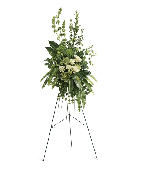 A peaceful display of affection and sympathy, this monochromatic spray of gorgeous fresh greens and pure white roses is a vision of tranquility.