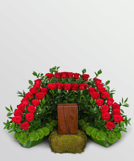 Roses are a beautiful choice for a Funeral or Celebration of Life Service. Our One Sweet Day Urn Tribute is an elegant design that features beautiful red roses and a variety of premium foliage, to be displayed around a photo or urn. Red roses symbolize respect, love, and courage in a sympathy design. Funeral flowers are a meaningful way to celebrate the life of the deceased, while providing comfort to the friends and family left behind.