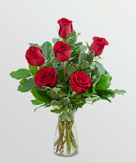 Red roses have always been the symbol of love and romance, and continue to be the best way to send your love. Express your feelings with these half dozen charming red roses, complemented with premium foliage. Say I love you with this classically simple and romantic gift.