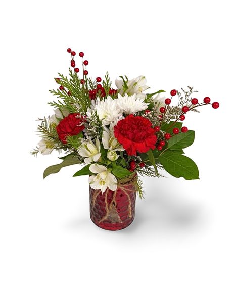 Add a festive touch to your holiday décor with this charming Mercury Glass Vase. Available in rich red or vibrant green, the vase features a gleaming, reflective finish that beautifully complements any seasonal setting. Hanging from its neck is a delicate wooden Christmas tree ornament, adding a rustic, whimsical accent. The arrangement is completed with lush Christmas greens and a mix of seasonal flowers, bringing warmth, color, and holiday cheer to your home. Perfect for tabletops, mantel displays, or as a thoughtful gift, this vase captures the spirit of the season in every detail.