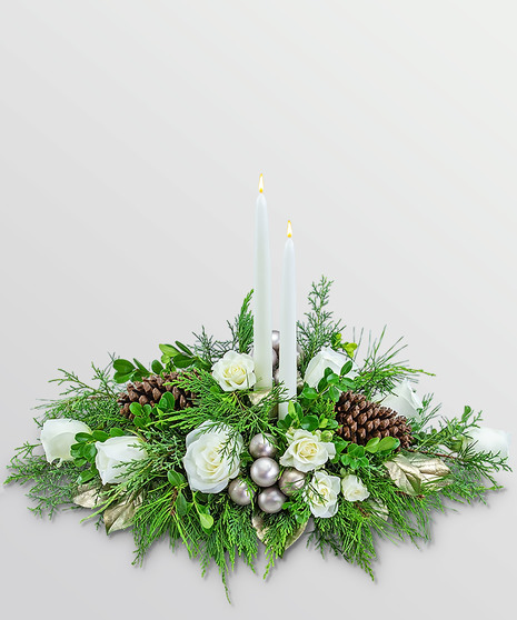 Your holiday table will shine with this stunning centerpiece! Roses, pinecones, and ornaments with assorted evergreen and foliage surround 2 white taper candles. Starlight is the perfect addition to any celebration.