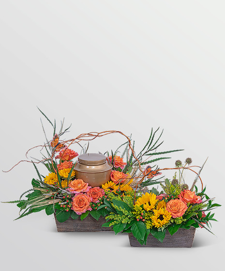 The Sunset Reflections Tribute is a beautiful way to reflect on your loved one's life. Sunflowers represent pure love and adoration, which makes these family flowers the perfect accent to a funeral or celebration of life ceremony. This memorial design features orange roses, bright sunflowers, hypericum berry, and curly willow, all artfully surrounding the urn. This tribute is perfect for cremation services or a Celebration of Life Service to honor your loved one.