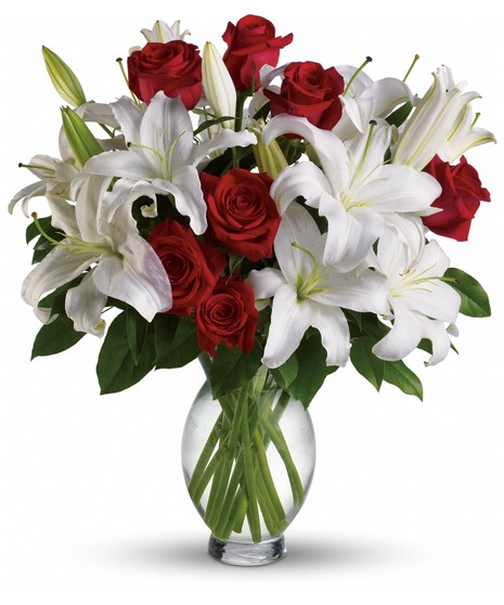 Hooray for love! Put these words into flowers with this magnificent bouquet of red roses and fragrant oriental lilies in a dazzling glass inspiration vase. Birthday, anniversary or any loving occasion, she'll get your message.