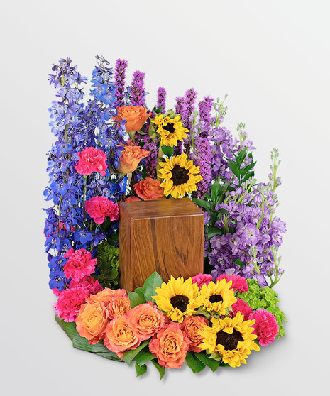 Sympathy flowers are a meaningful way to celebrate the life of the deceased, and forever treasure the memories you made together. Our Treasured Memories Surround features Free Spirit roses, sunflowers, bright pink carnations, liatris, blue delphinium, green hydrangea, stock, and premium foliage. Funeral flowers bring healing in many ways, they serve as a memorial to honor the one that we lost, all while providing comfort to the friends and family left behind.