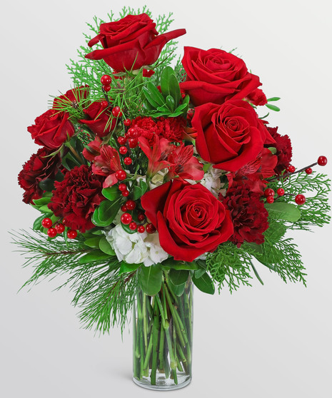 A classic holiday bouquet of flowers, Twilight Berry is a beautiful choice for any occasion. Our expert designers create a joyful design in perfect shades of red and green, featuring carnations, roses, Alstroemeria, and premium foliage and berries to convey your heartfelt holiday wishes. With Christmas just around the corner and New Year's Eve on its way, we're happy to help you brighten both days with a festive bouquet.
