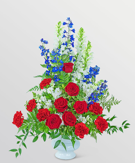 This beautiful red, white, and blue design honors the valiant effort of the ones who served our country with honor. It is filled with red roses and carnations, blue delphinium, and white snapdragons surrounded by a variety of premium foliage. The Valiant Urn is the perfect sympathy arrangement to send to a funeral or to a grieving family to let them know their loved one will never be forgotten.