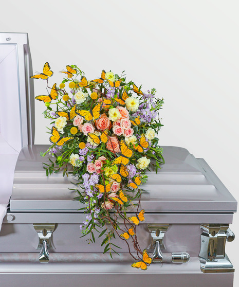 Our Wind Beneath My Wings Casket Scarf is a vibrant casket spray adorned with a delicate design of pinks, yellows, purples, and fluttering butterflies, symbolizing a graceful farewell. The harmonious blend of colors and elegant butterflies creates a serene and beautiful tribute, honoring the memory of a loved one with both warmth and serenity.
