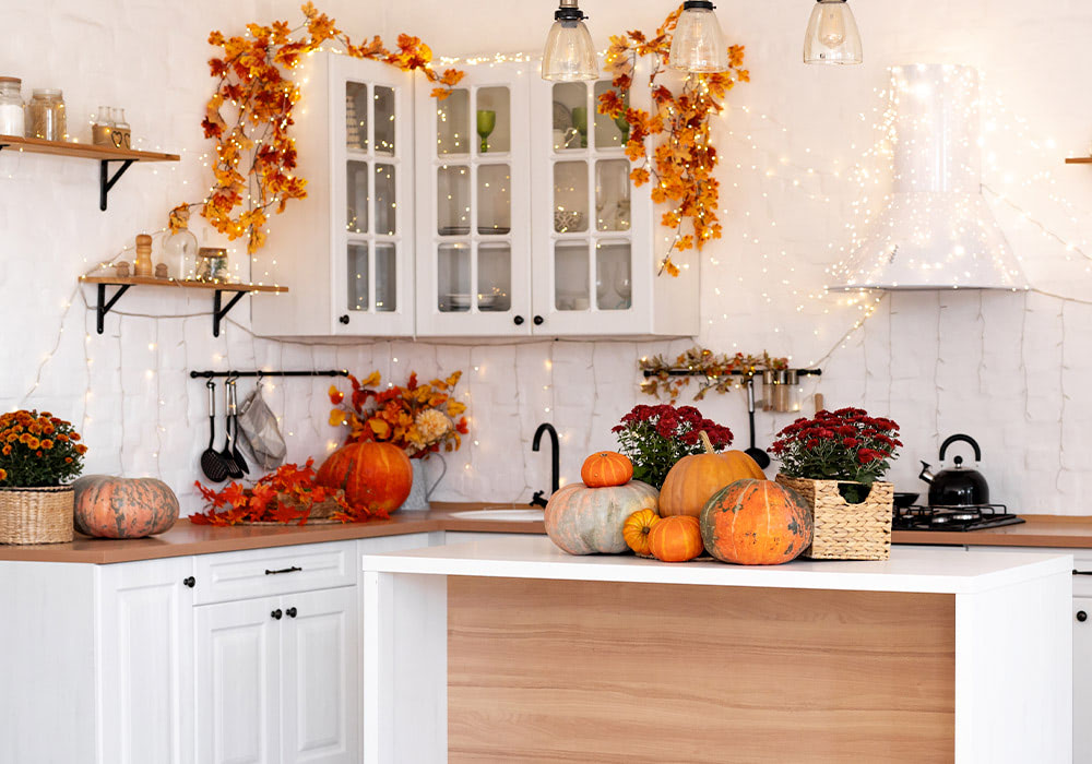 Instead of traditional bouquets, use floral garlands on top of cabinets and entryways. Small swags will look festive on the outside of cabinets, range hood, or kitchen island corners. Hanging wreaths on doors or decorating your light fixtures with seasonal greens can also add charm without taking up precious counter space. These touches will transform your kitchen into an extension of your entertaining space, blending function with beauty.