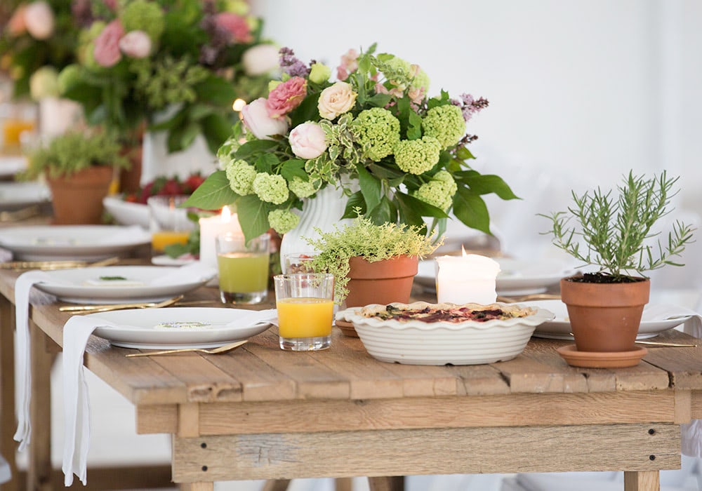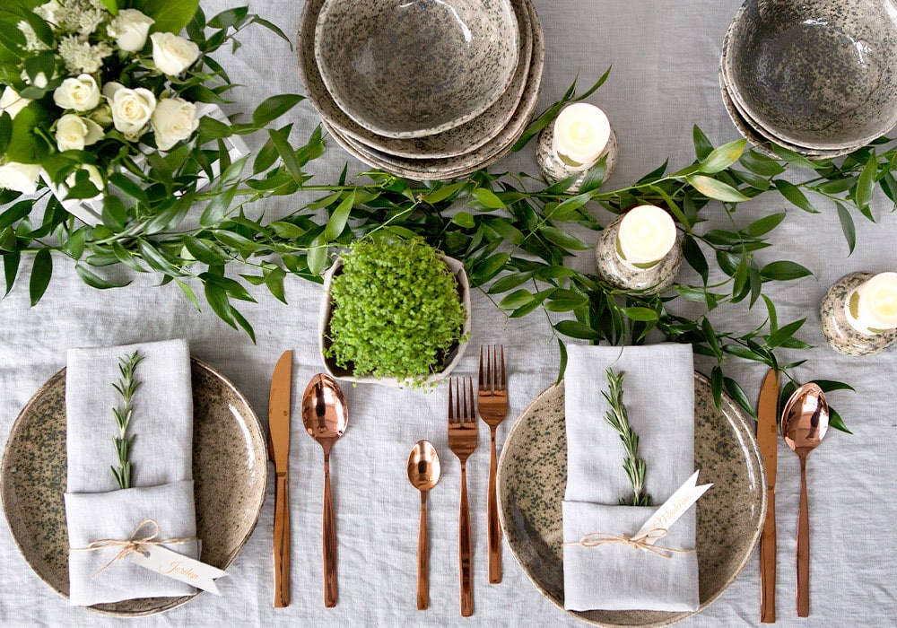 Vibrant green plants are also thriving in the springtime. As you celebrate special occasions this time of year, incorporate plants into your event. A runner made of eucalyptus or ivy creates a natural, organic, or even garden party vibe, while small potted succulents can double as place markers and take-home favors. Single green stems tucked into napkin folds or scattered around the table add a modern, minimalist feel. If you're feeling adventurous, try mixing green plants with bright flowers for a fresh, layered look that's trendy, youthful, and colorful, creating a warm, sunny garden aesthetic.