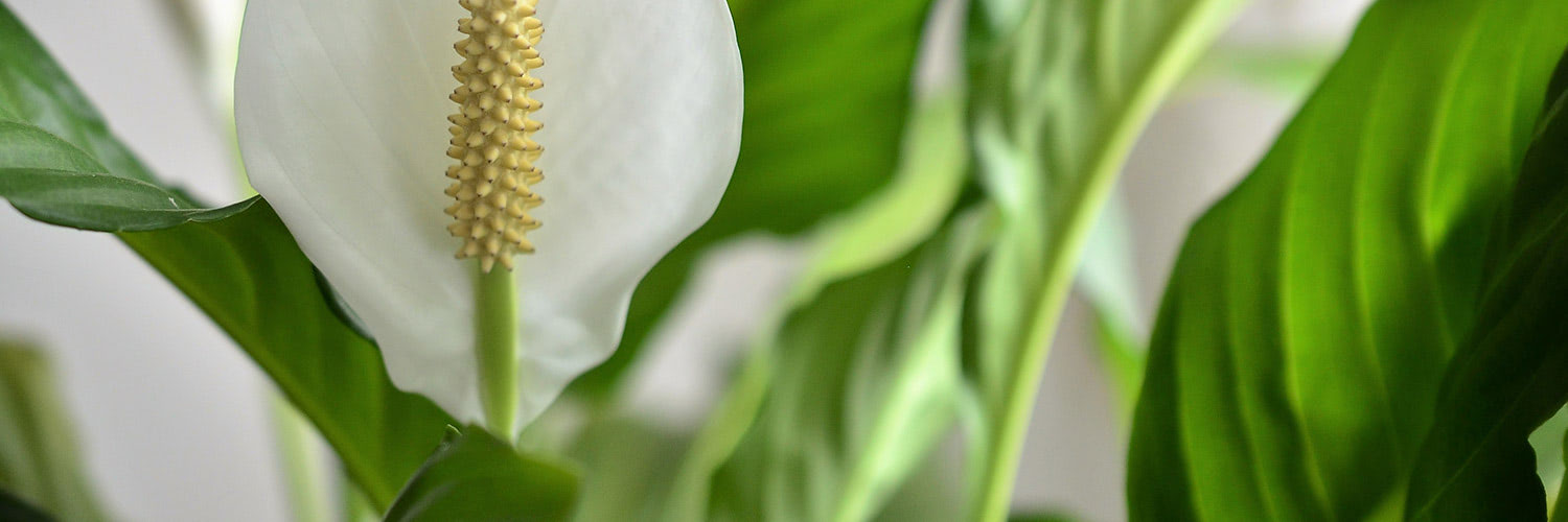 Easy to grow and beautiful, Peace Lily plants are tropical, evergreen plants that produce white flowers that can bloom throughout the year when properly cared for. The flower is actually a white "spathe" (a sheath-like leaf) surrounding a spadix (a vertical cone of tiny flowers). Peace Lilies are well known for their air-purifying abilities.
