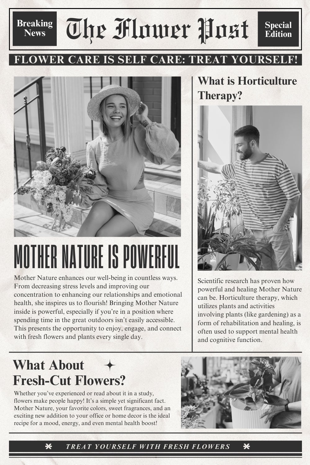 Mother Nature enhances our well-being in countless ways. From decreasing stress levels and improving our concentration to enhancing our relationships and emotional health, she inspires us to flourish! Bringing Mother Nature inside is powerful, especially if you're in a position where spending time in the great outdoors isn't easily accessible. This presents the opportunity to enjoy, engage, and connect with fresh flowers and plants every single day. Imagine the peace that washes over you as you sit in a room filled with greenery or the joy you experience as a bright bloom catches your eye - these small moments can actually make you feel better and keep you healthy.