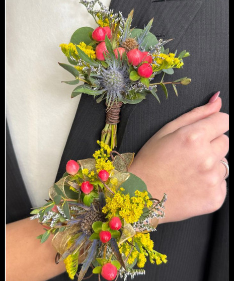 Includes: Solidago, Thistle, & Hypericum Berries Wrist Corsage & Boutonniere with Twine & Burlap Ribbon Accents